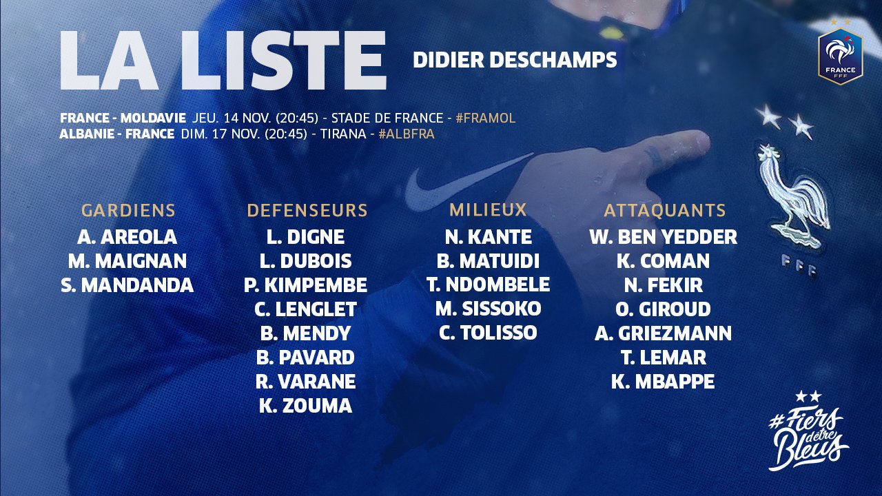 Equipe De France On Twitter Les 23 Joueurs Selectionnes Par Didier Deschamps Pour Les 2 Derniers Matchs De Qualifications A L Euro 2020 Fiersdetrebleus France Moldavie Jeudi 14 11 A 20h45 Albanie France